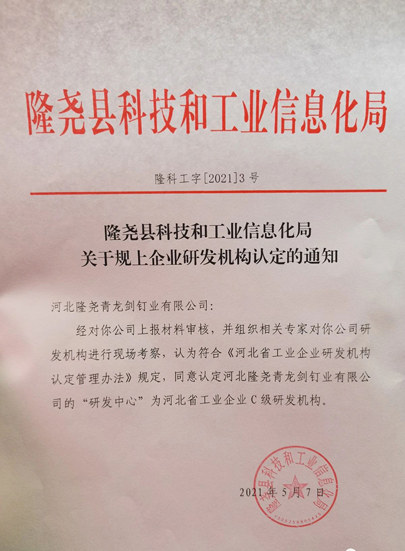 經(jīng)對你公司上報材料審核, 并組織相關(guān)專家對你公司研發(fā)機構(gòu)進(jìn)行現(xiàn)場考察, 認(rèn)為符合 《河北省工業(yè)企業(yè)研發(fā)機構(gòu)認(rèn)定管理辦法》規(guī)定,同意認(rèn)定河北隆堯青龍劍釘業(yè)有限公司的 "研發(fā)中心" 為河北省工業(yè)企業(yè)C 級研發(fā)機構(gòu)。