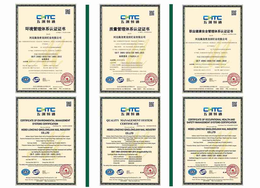 公司始終以“讓勞動(dòng)創(chuàng)造更多價(jià)值”為企業(yè)理念,致力于生產(chǎn)優(yōu)質(zhì)高效的釘類(lèi)產(chǎn)品。本次通過(guò)科學(xué)的管理體系和方法,不斷提升產(chǎn)品質(zhì)量與服務(wù)水平。此次公司通過(guò)了多項(xiàng)體系認(rèn)證,標(biāo)志著青龍劍公司一直保持符合國(guó)際標(biāo)準(zhǔn)化的管理體系要求,進(jìn)一步鞏固了青龍劍在行業(yè)中的領(lǐng)先地位。