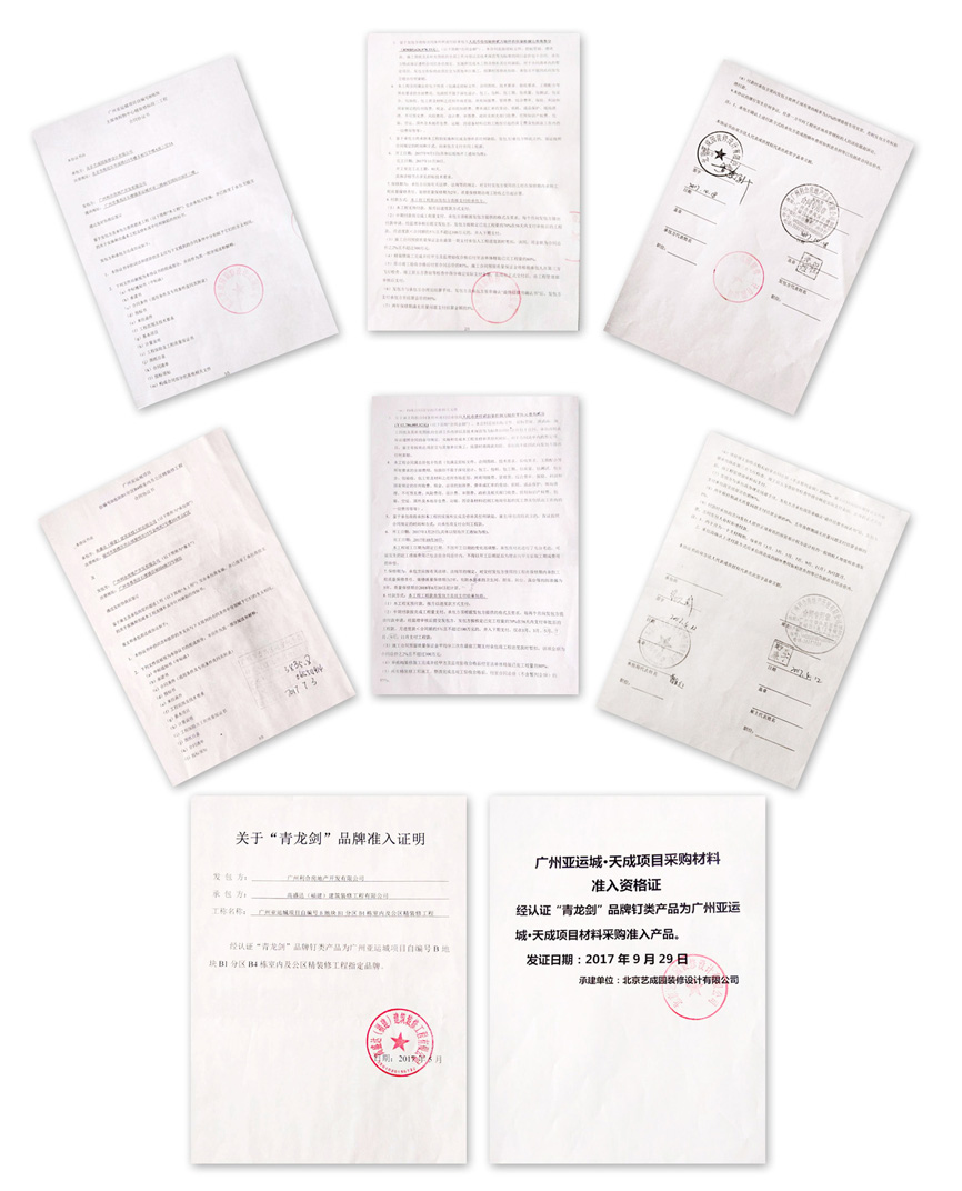 近日,收到廣州利合房地產(chǎn)發(fā)來的“青龍劍”品牌釘類產(chǎn)品在廣州亞運城項目成功入選的相關(guān)材料,青龍劍被列入工程項目中指定品牌釘類產(chǎn)品。